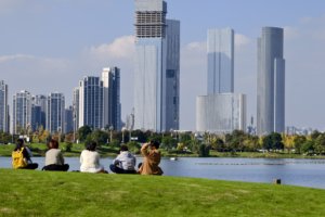 2025年11月13日,广安市民在月湖邻里公园漫步休闲,享受城市公园里的惬意时光。(无人机照片)