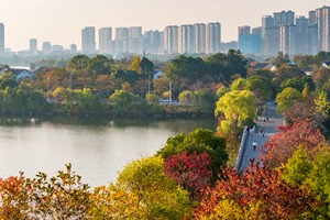 2025年11月13日,冬日暖阳下,四川广安月湖邻里公园披红戴绿,美不胜收。不少市民来此漫步休闲,享受城市公园里的惬意时光。