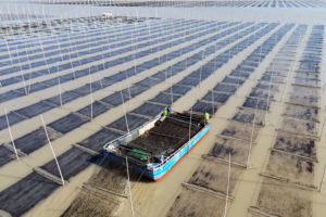 初冬时节,山东省荣成市爱伦湾海洋牧场呈现一派繁忙景象,运送海带苗的船只往来穿梭,海带养殖工人在茫茫的大海里,把夹好的海带苗插播到敷设好的海带筏架上。每年11月底至12月中旬,海带在海上养殖“插秧”季节。山东省荣成市各大海洋牧场纷纷开始海带布苗“插秧”,在辽阔的沧海拉开了海带养殖帷幕。