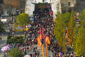 2025年11月21日晚,福建省福州市台江区的闽江之心海丝广场,两岸小唐音合唱团正在进行歌伴舞《凤梨酥配茉莉茶》节目表演。(无人机照片)
