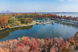 2025年11月28日,初冬时节,江苏省宿迁市泗洪县大楼街道桃花岛公园依旧层林尽染、色彩斑斓,与城市景观和谐相融,构成一幅秀美的生态画卷。