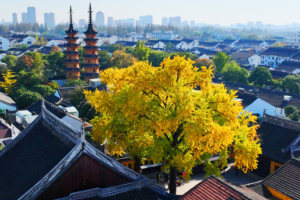 2025年12月1日,江苏省苏州市古典园林留园一株500年树龄银杏满树金黄。