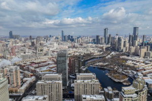 2025年12月3日,浙江省湖州市长兴县龙山街道龙山新区,行道树缤纷多彩,与建筑、河道、山丘相互映衬,呈现城市冬景如画。