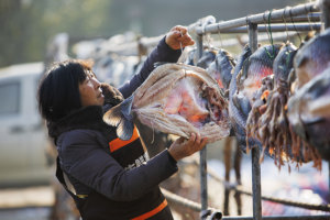2025年12月12日,安徽省铜陵市郊区大通镇澜溪老街,村民在阳光下晾晒腊味,浓郁的腊香弥漫整条老街。 大通古镇濒临长江,建镇已有千年,是第六批中国历史文化名镇、中国首批特色小镇之一。连日来,天气晴好,当地村民抢抓腊味晾晒、销售的黄金期,纷纷赶制腊鱼、腊肉等传统腊味,通过“线上+线下”模式销往各地,带动村民家门口就业、实现增收致富。
