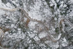 从航拍镜头俯瞰,连绵群山被白雪晕染成水墨画卷:深绿的林木与洁白的积雪交织,沟壑间云雾时聚时散,山顶的观景亭在雪色中若隐若现;林间步道上,游客驻足拍摄雾凇,冰晶在阳光折射下泛着细碎银光,偶有山风掠过,雪沫轻落,更添冬日静谧。