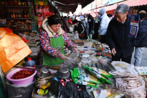 1月10日,襄汾县赵雄农贸市场一派繁忙景象,椒农忙着加工、分拣、装袋、过秤,为外地客商装车销售。