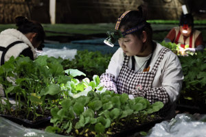 2026年1月14日,在安徽省亳州市涡阳县高炉镇五爱村一温室大棚里,返乡创业青年冯翠玲(左一)正和村民一起管护香草苗,这些香草苗将通过电商平台销售到全国各地。