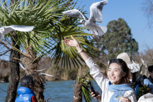 2026年1月19日,市民在青岛栈桥海滨赏雪景戏海鸥。据青岛水文公众号介绍,受强冷空气和暖湿气流共同影响,1月18日8时至19日8时,青岛市普降小到中雪,全市平均降水量2.6mm。雪后海滨红嘴鸥饥饿难耐,见人就扑疯狂卖萌乞食,吸引人投喂互动。