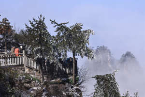 2026年1月21日,雪后浙江省湖州市安吉县境内的龙王山,在云雾的掩映之下银装素裹,冰雪奇景蔚为壮观,吸引大批徒步爱好者前来观赏打卡 。