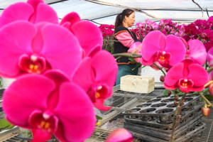 1月27日,在山东省青岛市城阳区夏庄街道舒心蝴蝶兰基地,花农在管护粉色系蝴蝶兰。