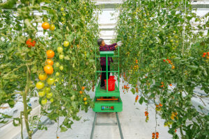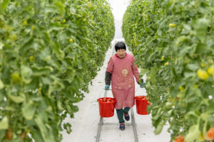 2026年1月27日,在安徽省亳州市蒙城县兴农绿港现代农业科技产业园的玻璃温室里,运输车辆正在外运工人刚采摘的西红柿。