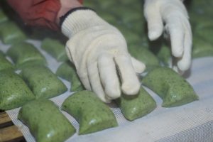 2026年1月27日,位于湖北省宜昌市夷陵区龙泉镇的高铁宜昌北站产业园(龙泉片区)里,一家食品企业工人制作手工红油包子。