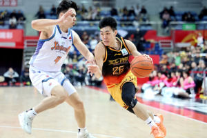 2026年2月1日,在江苏省南通市,深圳马可波罗队球员贺希宁(右)在比赛中带球突破。