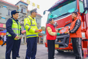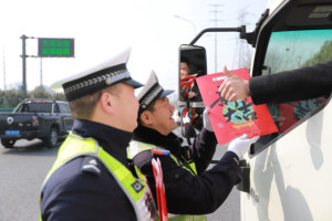 2026年2月3日,江苏省连云港市港航公安局交通管理大队民警在交通管制路段指挥车辆有序通行。