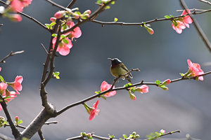2026年2月4日,湖北省襄阳市保康县清溪河景观公园内的海棠花迎春绽放。