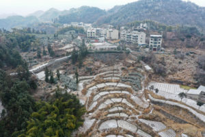 2026年2月1日,安徽省安庆市岳西县天堂镇石桥社区,福满园养老中心、就业扶贫车间,与群山、民居、道路交相辉映,构成一幅宜居宜养、和美共生的新时代大别山乡村画卷。(无人机照片)