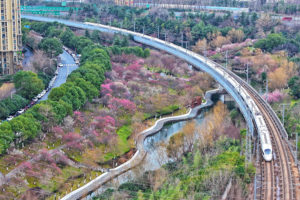 2026年2月5日,广西壮族自治区贺州市爱莲湖公园樱花竞相绽放(无人机照片)。