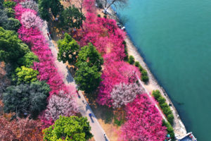2026年2月7日,安徽省黄山市歙县雄村镇卖花渔村漫山遍野的梅花绽放,与徽派村落民居相映成趣,美不胜收,吸引游客前来赏花游玩。