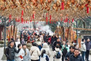 2026年2月10日,市民在江苏省南通市崇川区“城门挂春联,江苏开门红”活动揭联仪式现场开心留影。