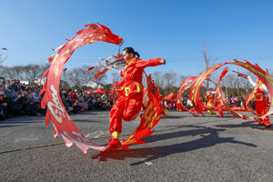 2月10日,在山东省聊城市茌平区菜屯镇南海子村“村晚”现场,村民们表演《红色娘子军》。