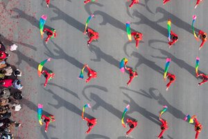 2026年2月11日,在甘肃省酒泉市金塔县东坝镇小河口村社火排练现场,社火队的队员们正在排练舞狮子、打锣鼓等传统民俗文化社火。(无人机相片)