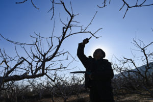 2026年2月26日,在河北省邢台市广宗县东召乡田家屯村拍摄的雨中金银花树长出新芽叶。