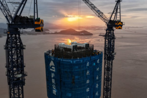 2026年2月27日晨曦,山东省荣成市爱伦湾海洋牧场,渔民驾驶船只奔赴养殖区收获海带,供应春季市场。(无人机照片)