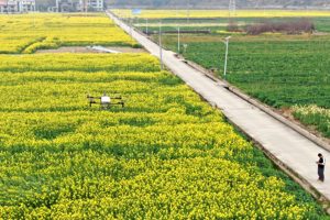 2026年2月28日,在安徽省芜湖市湾沚区六郞镇王屋村的麦田里,国网芜湖供电公司党员服务队正应用自主研制的移动式光储充电宝为农户植保无人机提供充电服务。(无人机拍摄)