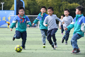 2026年3月11日,河北省邢台市广宗县实验小学学生在体验操作机器狗进行表演。