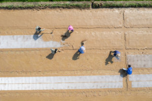 2026年3月12日,在湖南省娄底市双峰县荷叶镇清泉村一处集中育秧点,农民在田间劳作(无人机照片)。