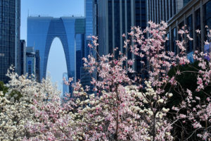 当前位置:自然> 上海陆家嘴玉兰花掩映城市地标 迷人春色吸引游客