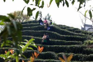 2026年3月24日,贵州省黔东南苗族侗族自治州岑巩县天马镇苗落村生态茶园里,采茶工在采摘新鲜春茶。 春风拂过山岗,茶芽吐露新绿。眼下,贵州省岑巩县茶园迎来春茶采摘期,天马镇苗落村生态茶园,漫山茶树新芽竞绽,翠绿欲滴、茶香四溢,勾勒出一幅生机盎然的春茶画卷。 据悉,岑巩县天马镇茶园总面积1万余亩,投产面积0.89万亩,主要种植福鼎大白等品种,有950亩茶园获欧标与有机认证。2025年实现年产量500吨、产值1560万元,产品畅销北京、上海、广州等一线城市,还通过间接出口远销东南亚、欧洲等多个国家。