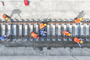 2025年9月19日,浙江省湖州市德清县杭德市域铁路Ⅱ标段施工现场,中铁十一局建设者正在进行铺轨作业。
